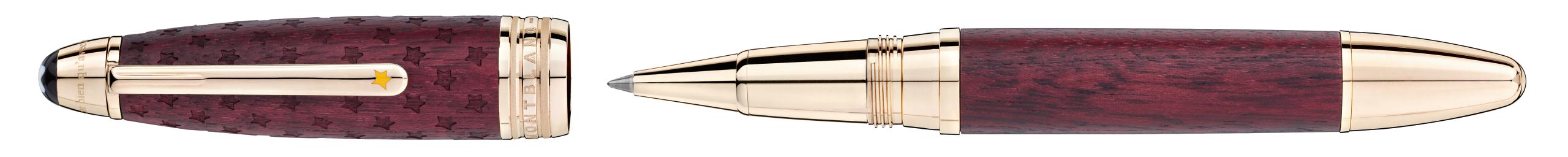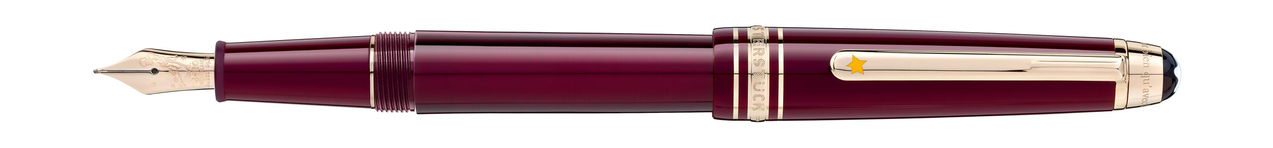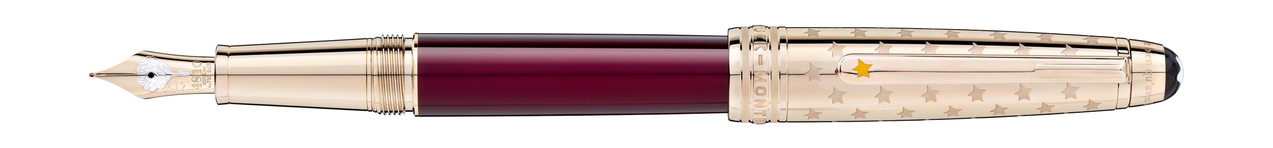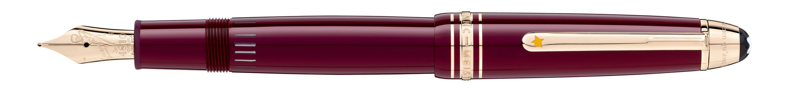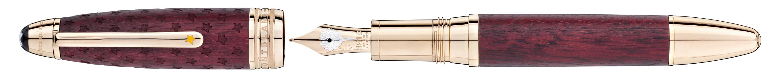 Der Meisterstück Le Petit Prince Solitaire Le Grand Füllfederhalter, dessen Kappe aus Holz gefertigt und burgunderrot gefärbt ist, verweist auf die sternförmige Ästhetik. Auf den drei platinierten Ringen ist der Montblanc Schriftzug zu lesen und den Clip ziert ein Stern aus gelbem Lack. Vollendet wird das Schreibgerät von einer handgefertigten Feder mit 750er/18 K champagnerfarbener Vergoldung und dem Motiv der gezeichneten Rose des kleinen Prinzen, einem Symbol der Liebe zwischen den beiden Figuren.