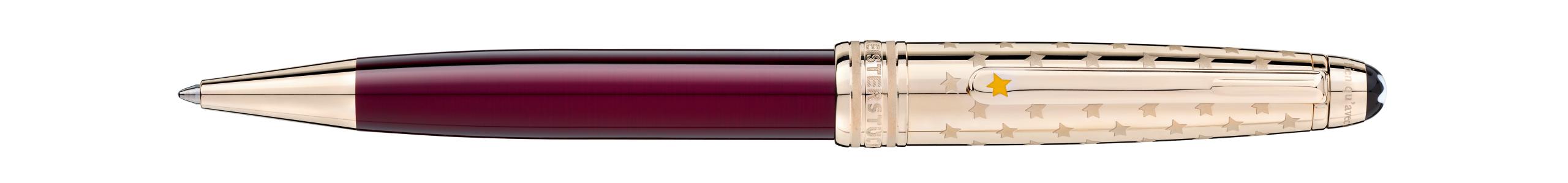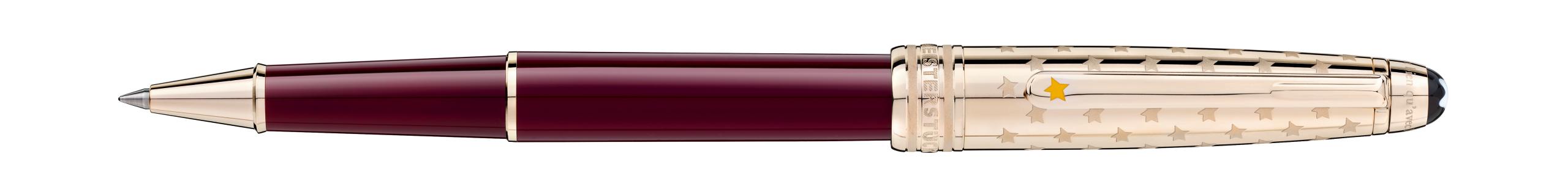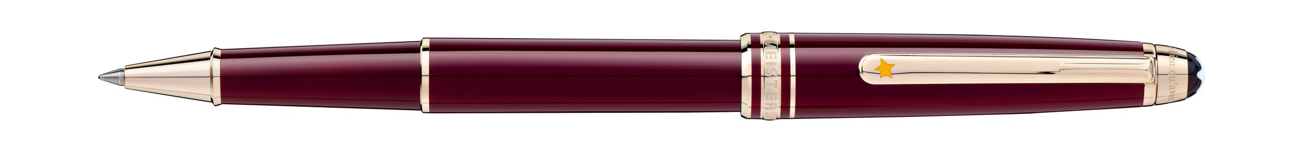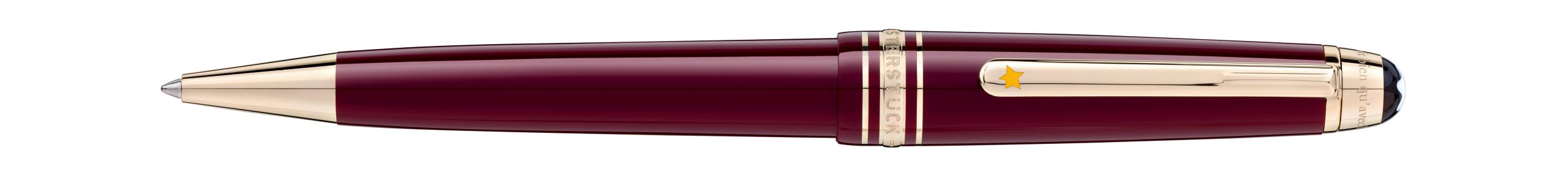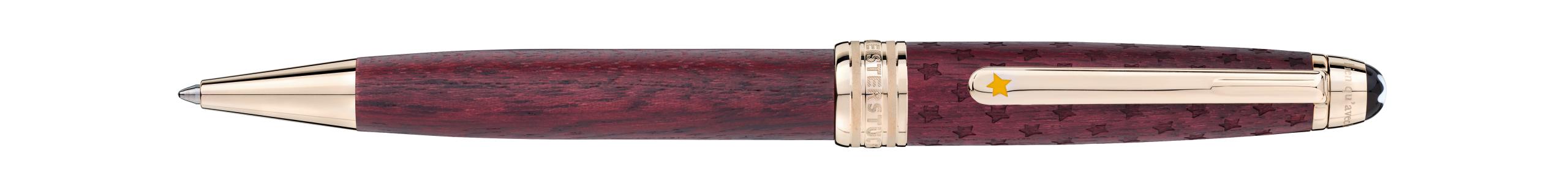 Der Meisterstück Le Petit Prince Solitaire Le Grand Füllfederhalter, dessen Kappe aus Holz gefertigt und burgunderrot gefärbt ist, verweist auf die sternförmige Ästhetik. Auf den drei platinierten Ringen ist der Montblanc Schriftzug zu lesen und den Clip ziert ein Stern aus gelbem Lack. Vollendet wird das Schreibgerät von einer handgefertigten Feder mit 750er/18 K champagnerfarbener Vergoldung und dem Motiv der gezeichneten Rose des kleinen Prinzen, einem Symbol der Liebe zwischen den beiden Figuren.