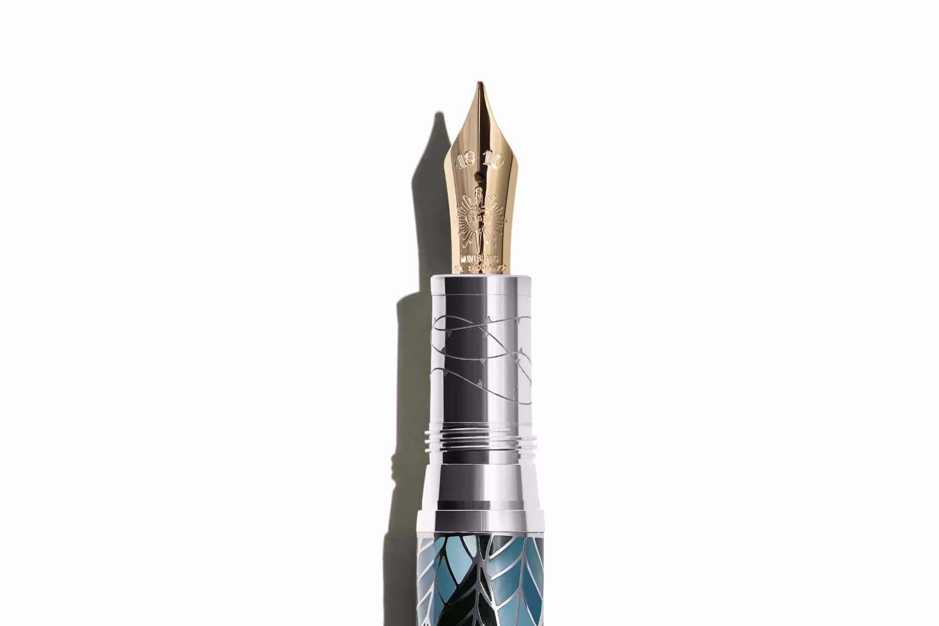 William Shakespeares Romeo und Julia sind die Verkörperung bedingungsloser Liebe bis in den Tod. Die Geschichte der beiden Liebenden, die aufgrund der Feindschaft zwischen ihren Familien ums Leben kommen, ist bis heute eines der relevantesten und bewegendsten literarischen Werke, die je geschrieben wurden. Die Montblanc Meisterstück Romeo and Juliet Kollektion ist diesem bedeutenden Werk der Literaturgeschichte gewidmet. Der Romeo gewidmete LeGrand Füllfederhalter ist aus blaugrünem Edelharz gefertigt, um die himmlische Aura des Gartens zu beschwören, und wird durch kontrastierende platinbeschichtete Beschläge zusätzlich aufgewertet. Auf der Kappe ist eine zarte Rose inmitten eines fein gearbeiteten Blattmusters abgebildet. Sie symbolisiert Julias innige Hoffnung, dass ihre Liebe zueinander durch ihr Familienerbe nicht getrübt wird – so wie der reine, bezaubernde Duft einer Rose für immer Bestand hat. Die handgefertigte Feder aus massivem 585er Gold trägt eine symbolträchtige Prägung: den Namen „Romeo“, verewigt in einem von einem Dolch durchbohrten Herzen, umrahmt von sternförmigen Strahlen.